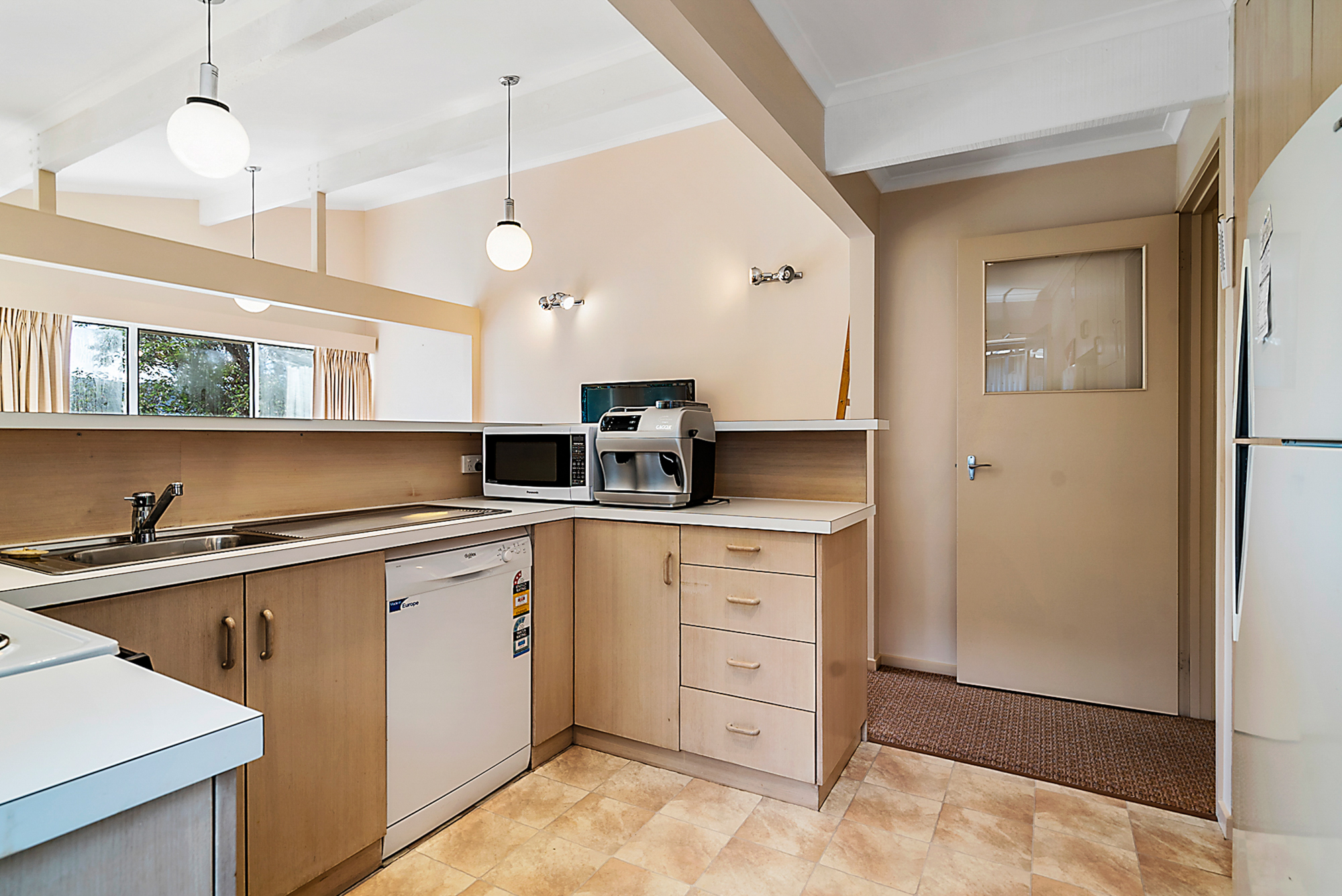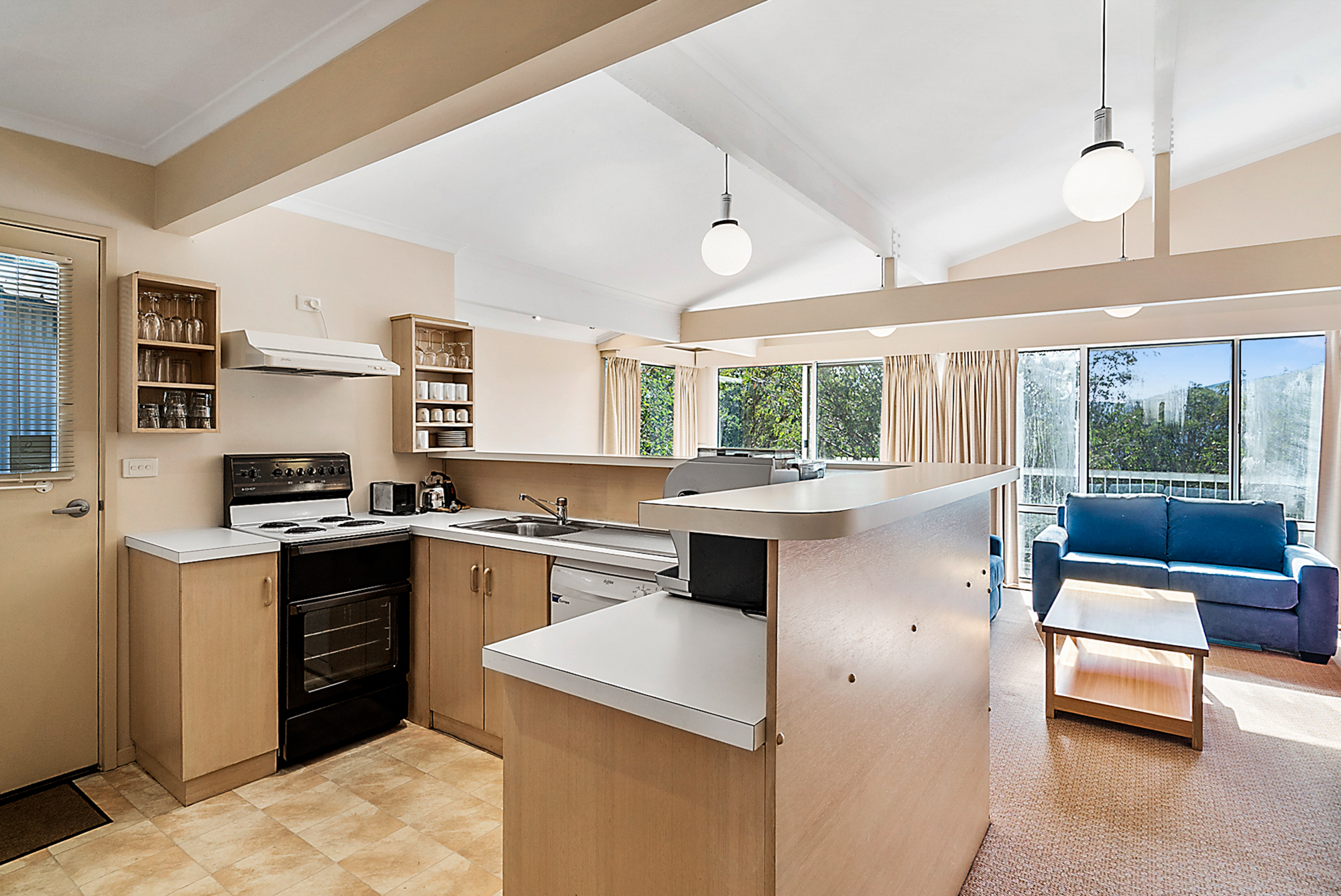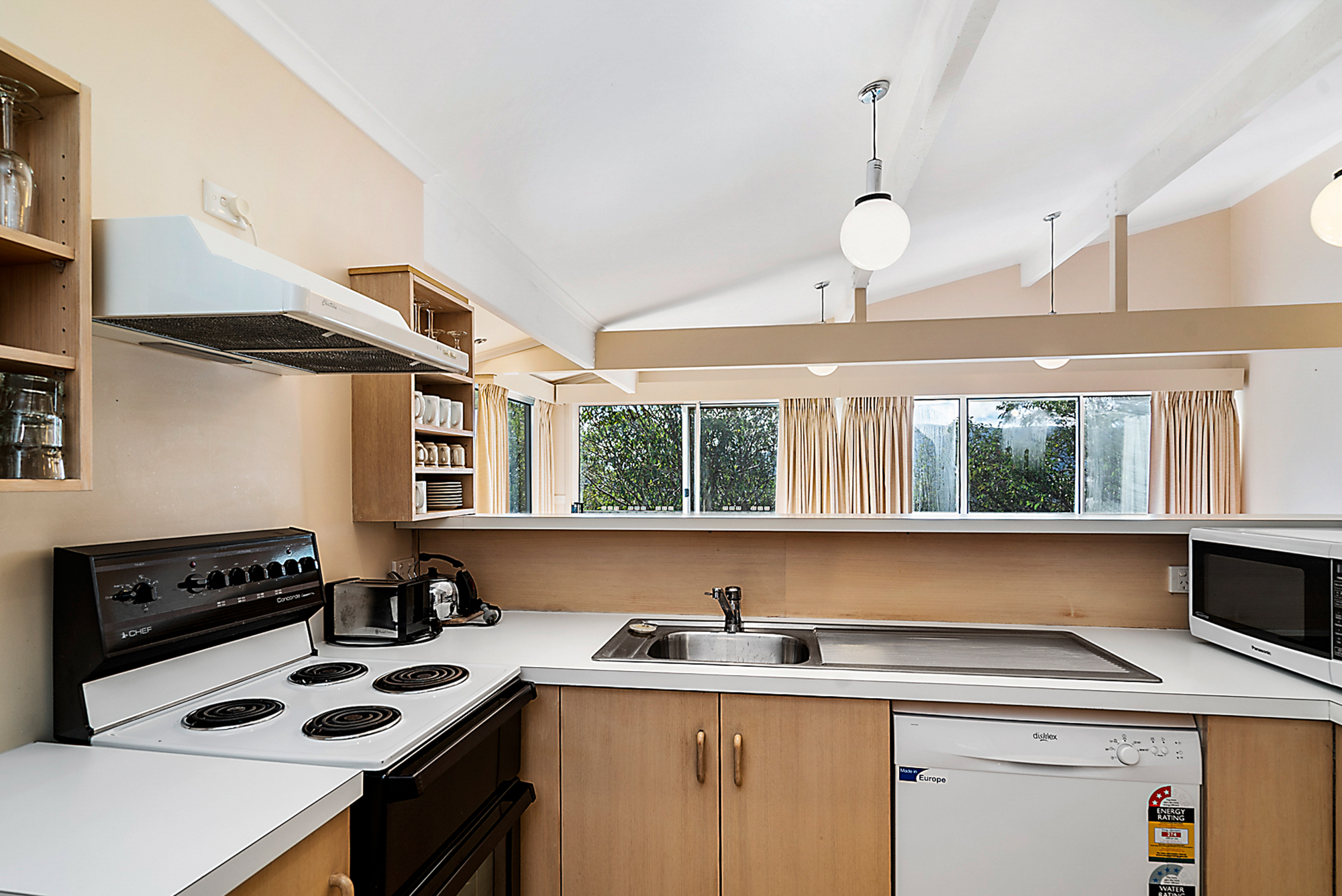 The kitchen is fully equipped with gas cook top and electric oven, microwave, dishwasher fridge/freeze, crockery cutlery and cooking utensils.